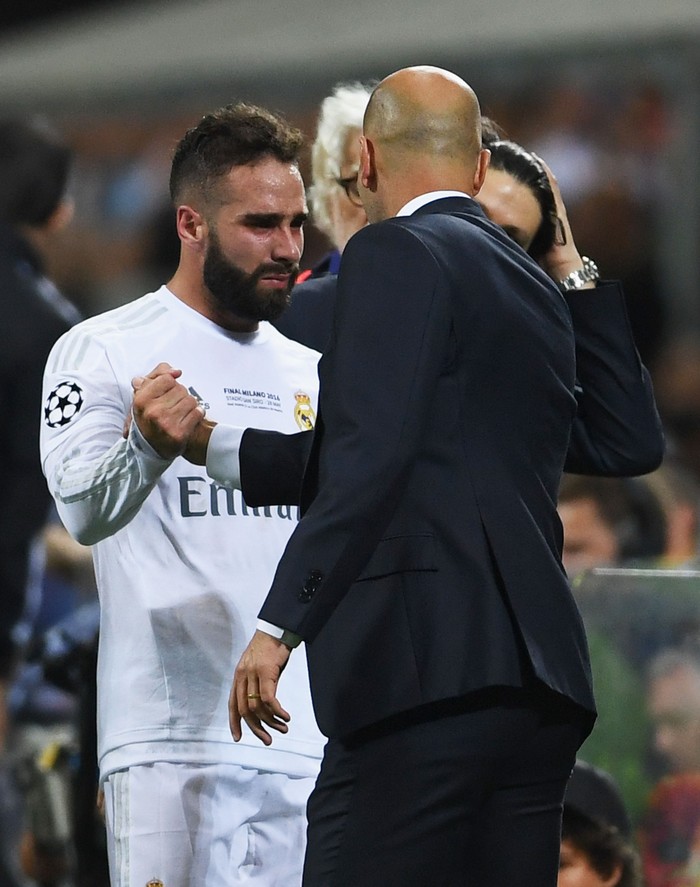 Bek Real Madrid itu mengalami cedera paha dalam kemenangan atas Atletico Madrid di final Liga Champions, Sabtu (28/5/2016). Carvajal butuh waktu setidaknya tiga pekan untuk menyembuhkan diri padahal Piala Eropa akan dimulai kurang dari dua pekan lagi.