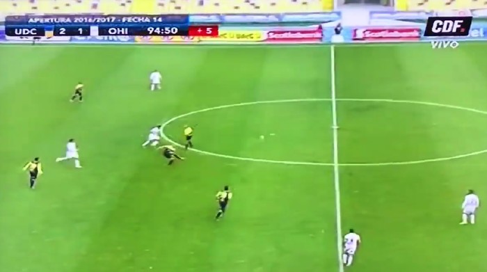 Dengan tim tamu O'Higgins sedang tertinggal 1-2, kiper Miguel Angel Pinto maju jauh meninggalkan area gawang. Tujuannya tentu saja menyapu bola jauh ke depan agar rekan-rekan setimnya bisa berusaha mencari gol penyama kedudukan.