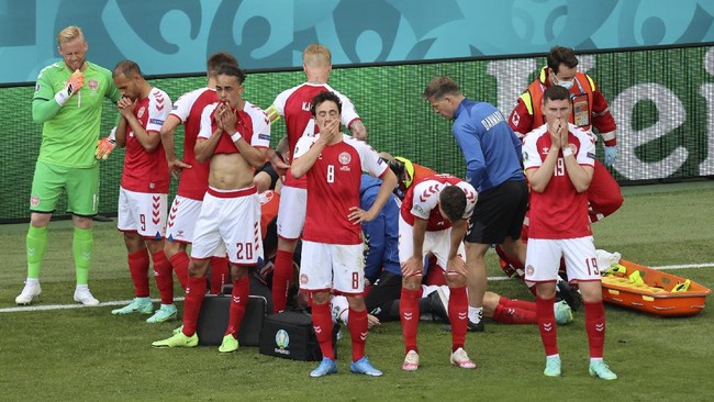Laga Grup B Euro 2020 antara Denmark vs Finlandia di Stadion Parken, Kopenhagen, Sabtu (12/6/2021) malam WIB, diwarnai insiden Eriksen kolaps. Pemain Inter Milan itu tiba-tiba ambruk tak sadarkan diri di menit ke-43.