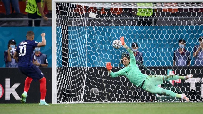 Di babak tos-tosan itu, Prancis kalah 4-5. Satu penendangnya, yang juga eksekutor terakhir, Kylian Mbappe, gagal mengeksekusi penaltinya. Arah bola sepakannya bisa ditepis kiper Swiss, Yann Sommer.