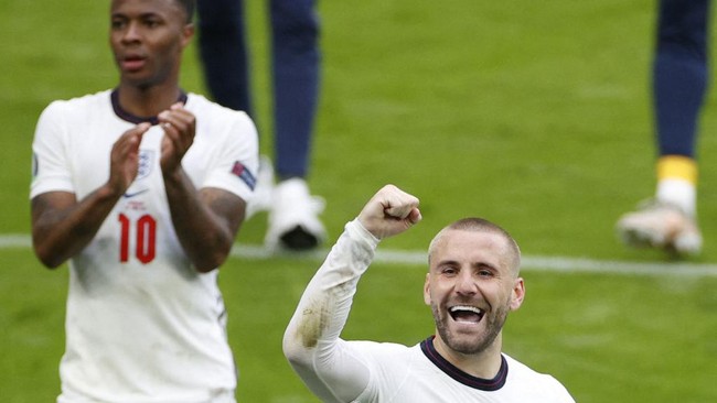 Bek kiri Inggris Luke Shaw sedang gembira betul. Shaw bersinar dan Inggris pun berhasil menembus perempatfinal Piala Eropa 2020.