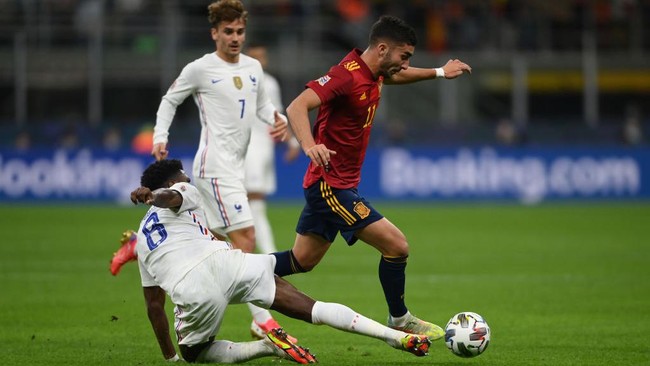 Final UEFA Nations League 2021 mempertemukan Spanyol vs Prancis di San Siro, Milan, Senin (11/10/2021) dini hari WIB. Les Bleus hampir membuka gol lebih dulu ketika laga baru berjalan lima menit.