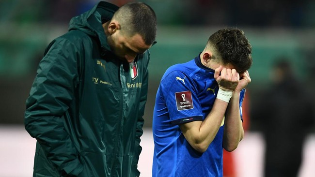 Italia takluk 0-1 dari Makedonia Utara dalam laga playoff zona Eropa di Palermo, Jumat (25/3/2022) dini hari WIB. Hasil ini membuat Gli Azzurri harus absen dua kali beruntun di Piala Dunia. Empat tahun silam, mereka juga hanya menjadi penonton.