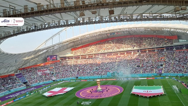 Di Khalifa Stadium, saya menempati tribune yang didominasi oleh pendukung Team Melli. Semua orang Iran yang di tribune bergumam dan membunyikan terompet, sampai lagu kebangsaan mereka selesai. Di atas lapangan, ternyata para pemain Iran melakukan aksi diam.