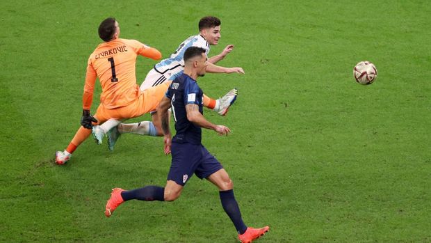 Argentina mendapat penalti semenit berselang. Julian Alvarez yang menerimpan umpan terobosan dari tengah lapangan jatuh di kotak penalti usai bertabrakan dengan Livakovic. Wasit Daniele Orsato tak ragu menunjuk titik putih.