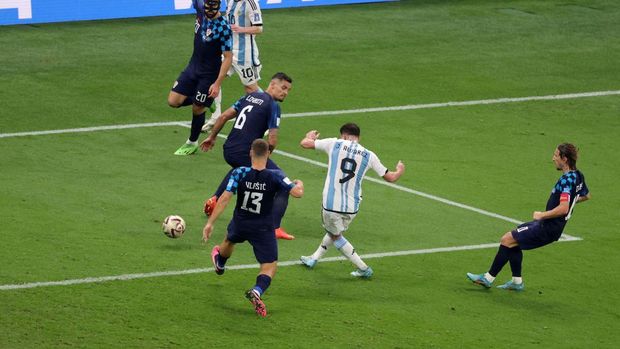 Bermain di Lusail Stadium, Rabu (14/12) dini hari WIB, Lionel Messi membuka skor Argentina lewat tembakan penalti di menit ke-34. Julian Alvarez menambah keunggulan lima menit berselang lewat aksi individu dari tengah lapangan.