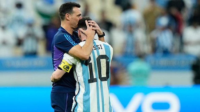 Usai pertandingan, terlihat momen emosional di kubu Argentina. Lionel Messi memeluk Lionel Scaloni, pelatih Tim Tango.