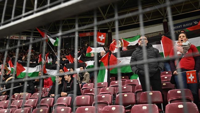 Duel Swiss vs Israel di kualifikasi Piala Eropa 2024 diramaikan dengan bentangan bendera Palestina di tribun. Video penampakannya viral di media sosial.