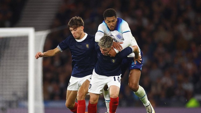 Jude Bellingham mendapat satu kartu kuning dalam laga Skotlandia vs Inggris. Eks Borrusia Dortmund itu terlibat pertikaian dengan pemain Skotlandia, Jack Hendry, menyusul pelanggaran Kalvin Phillips pada menit ke-42.
