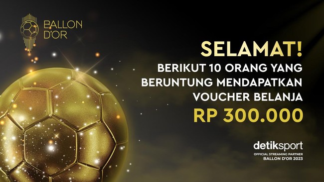 Nah, siapa nih, detikers yang kemarin sudah ikutan voting jagoan pemenang Ballon d'Or 2023? Selamat! Untuk yang telah ikutan voting pemenang Ballon d'Or 2023 kemarin, nama-nama di bawah ini berhak untuk mendapatkan hadiah voucher belanja senilai Rp 300.000 untuk 10 orang beruntung.