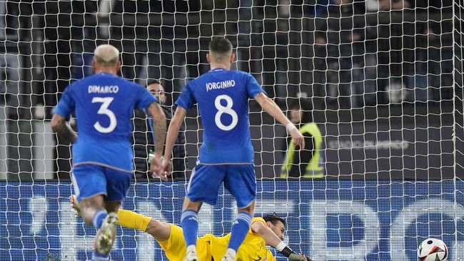 Jorginho gagal megeksekusi penalti saat Italia menang 5-2 atas Makedonia Utara pada lanjutan Kualifikasi Piala Eropa 2024, Sabtu (18/11). Sepakan 12 pas Jorginho terlalu lemah sehingga arahnya terbaca kiper lawan.