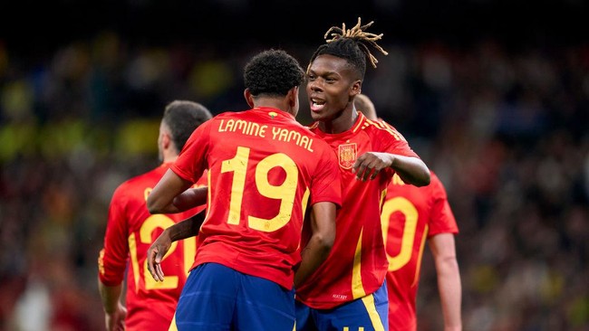 Pedri yang bikin dua gol di laga ini turut memuji penampilan dua sayap Spanyol yang main sejak menit awal Lamine Yamal dan Nico Williams.