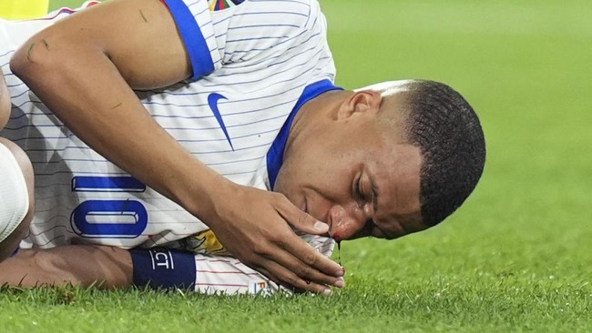 Hidung Mbappe patah usai membentur bahu bek Austria, Kevin Danso di pengujung babak kedua dalam laga yang berlangsung di Dusseldorf, Selasa (18/6) dinihari WIB. Ia kemudian digantikan oleh Olivier Giroud.