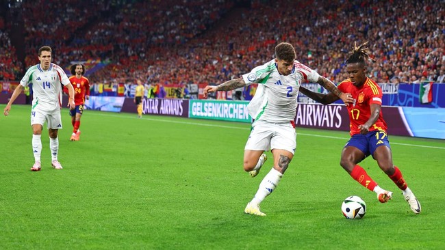 Spanyol vs Italia berlangsung dalam matchday kedua Grup B Piala Eropa 2024. Gol tunggal Tim Matador di Veltins-Arena, Jumat (21/6/2024) dini hari WIB, lahir lewat bunuh diri Riccardo Calafiori pada menit ke-55.
