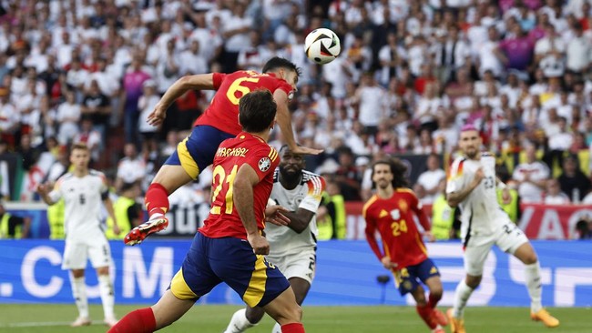 Ketika laga sepertinya akan ditentukan lewat adu penalti, Merino muncul di antara Antonio Ruediger dan bek Jerman lainnya, untuk menanduk umpan silang Olmo da Neuer cuma terpaku melihat bola bersarang di pojok kanan atas gawangnya.