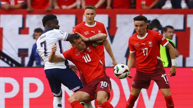 Satu peluang terbaik Inggris pada menit ke-45 saat Mainoo mendapat ruang tembak, namun bola sepakannya bisa diadang Xhaka.