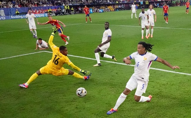 Yamal mulanya sedikit mengontrol bola mesti dibayangi Rabiot. Lalu, pemain berusia 16 tahun itu menyepak bola dengan kaki kirinya. Si kulit bundar lantas mengalir dengan melengkung ke pojok kanan atas gawang Maignan.