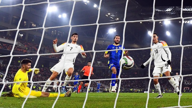 Jerman terus melakukan tekanan. Tembakan Kai Havertz cuma bersarang di sisi luar jala gawang Bosnia, sedangkan sepakan melengkung Musiala masih melenceng.