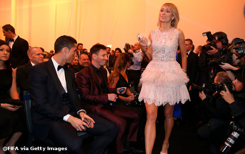 Stephanie Roche tak pelak menjadi salah satu primadona di acara gala dinner FIFA Ballon d'Or 2014 di Zurich. Semua mata tertuju padanya, termasuk CR7 dan Lionel Messi.
