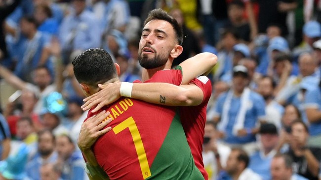 Jakarta - Pelatih Timnas Portugal Fernando Santos menertawakan soal perdebatan gol pertama Portugal lawan Uruguay milik Cristiano Ronaldo atau Bruno Fernandes. Ia juga menolak bahwa kemenangan Portugal adalah berkat Bruno Fernandes.