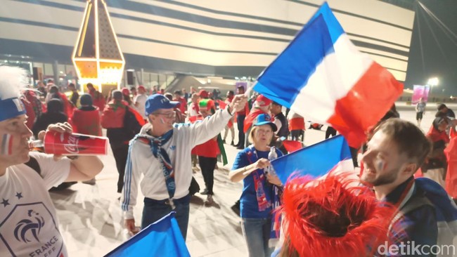 Jakarta - Para suporter Prancis menyambut sukacita kemenangan tim mereka melawan Maroko 2-0 di semifinal. Mereka menyalakan kembang api saat menggelar nobar di Paris, Prancis.