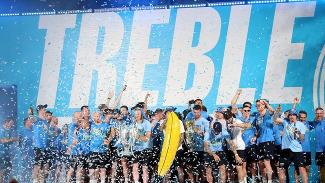 Jakarta - Manchester City merayakan treble winners bersejarah mereka. Hujan yang turun tak menyurutkan kemeriahan perayaan.
