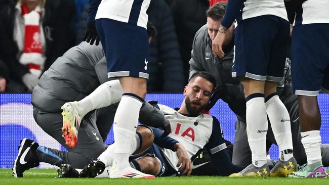 Jakarta - Gelandang Tottenham, Rodrigo Bentancur tersungkur saat berusaha menanduk bola sepak pojok Liverpool. Ia jatuh saat tangan kanannya masih terbentang keluar sehingga tertekuk tak semestinya.