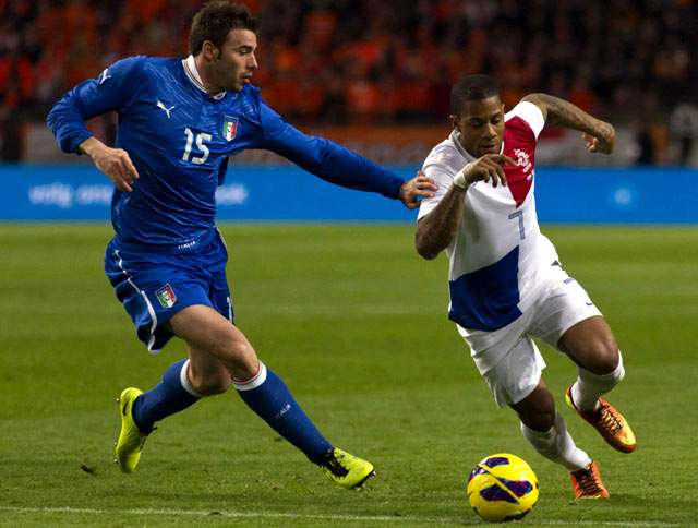 Jeremain Lens berhasil melewati kawalan Andrea Barzagli. Dalam pertandingan ini, Jeremain Lens membobol gawang Belanda di menit ke-33. Reuters/Michael Kooren.