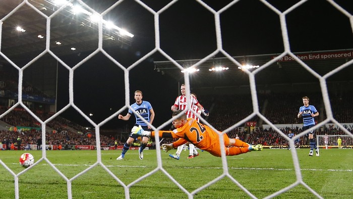 Pada laga pekan ke-34 yang dihelat di Britannia Stadium, Selasa (19/4/2016) dinihari WIB, Spurs memimpin duluan di babak pertama lewat Harry Kane. Reuters/Darren Staples.