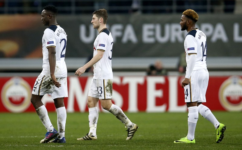 Victor Wanyama, Ben Davies, dan Georges-Kevin Nkoudou terlihat kecewa usai dikalahkan oleh Gent di Ghelamco Arena, Jumat (17/2/2017) dinihari WIB. Pool/Paul Childs/Reuters.
