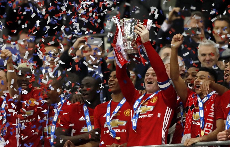 Wayne Rooney mengangkat trofi Piala Liga Inggris. Pool/Carl Recine/Reuters/detikFoto.