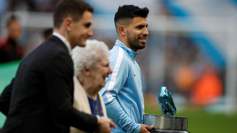 Sebelum duel City vs Arsenal tersebut dimulai di Etihad Stadium, digelar acara penghargaan kecil untuk Sergio Aguero. Aguero sebelumnya mencatatkan diri sebagai top skorer sepanjang masa di City menggusur Eric Brook, lewat golnya ke gawang Napoli di Liga Champions. (Foto: Phil Noble/ REUTERS)