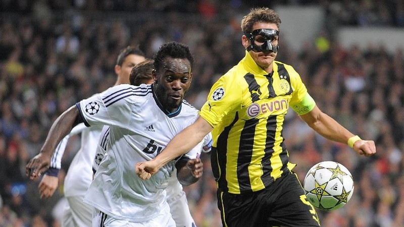 Mantan kapten Borussia Dortmund, Sebastian Kehl, memakai topeng pelindung pada laga Liga Champions melawan Real Madrid pada 2012 lalu. Foto: Denis Doyle/Getty Images