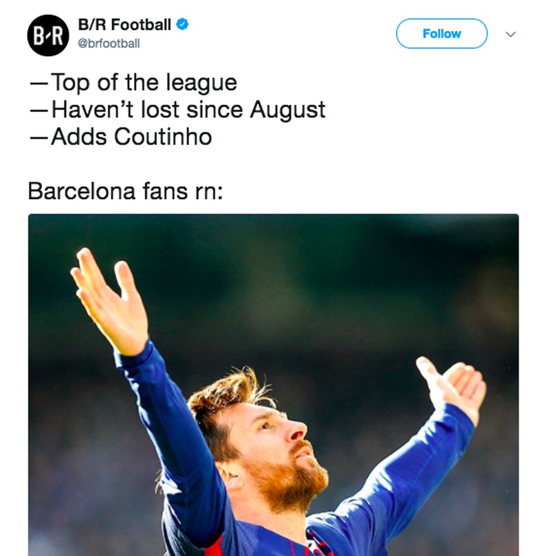 Akun twitter Barcelona langsung bereaksi begitu rilis resmi soal transfer Philippe Coutinho dimuat ke publik. Messi diibaratkan senang dengan kedatangan Coutinho (Istimewa)