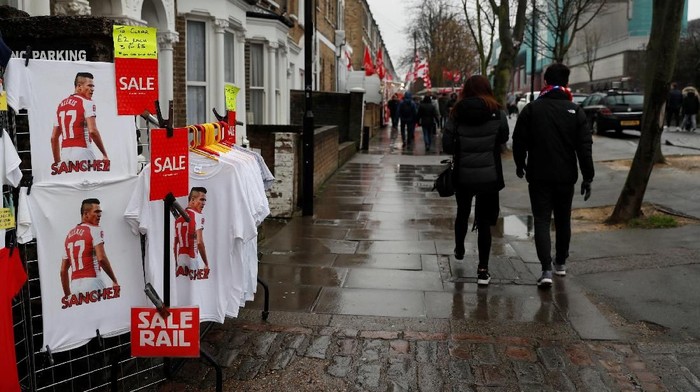 Salah satu pemandangan dari penjaja pernak-pernik pertandingan di dekat Stadion Emirates menjelang laga Arsenal vs Crystal Palace. Perhatikan coretan harga "spesial", di kertas warna kuning, untuk kaus-kaus ini. (Foto: Paul Childs/Action Images via Reuters)