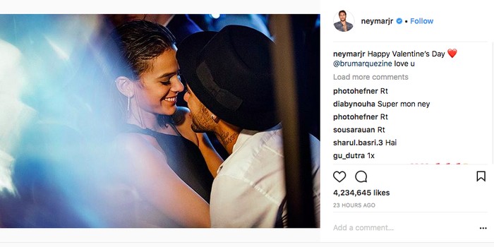 Pemain Paris Saint-Germain Neymar mendedikasikan ucapan selamat hari Valentine untuk kekasihnya tersayang Bruna Marquezine. (Foto: Internet)