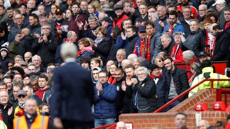 Wenger menempati bench tim tamu di Old Trafford saat mendampingi Arsenal pada pertandingan yang digelar Minggu (29/4/2018). Saat memasuki lapangan permainan, manajer asal Prancis itu mendapatkan tepuk tangan meriah dari penonton. (Foto: Carl Recine/Action Images via Reuters)