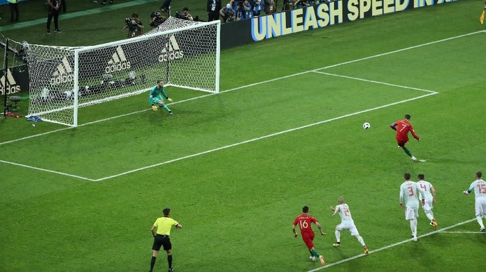 Cristiano Ronaldo (Portugal) mencetak penalti pertama Piala Dunia 2018. Eksekusinya sukses dalam laga Portugal vs Spanyol. (Foto: Lucy Nicholson/Reuters)