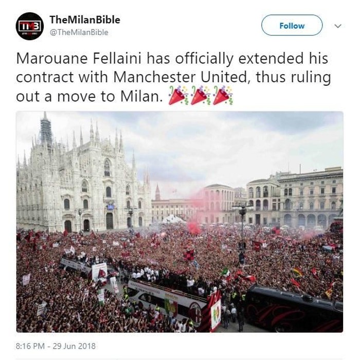Marouane Fellaini sempat dikabarkan akan ke AC Milan, tapi tak terjadi setelah memperpanjang kontrak dengan MU. Fans Milan pun sepertinya senang. (Foto: Twitter)