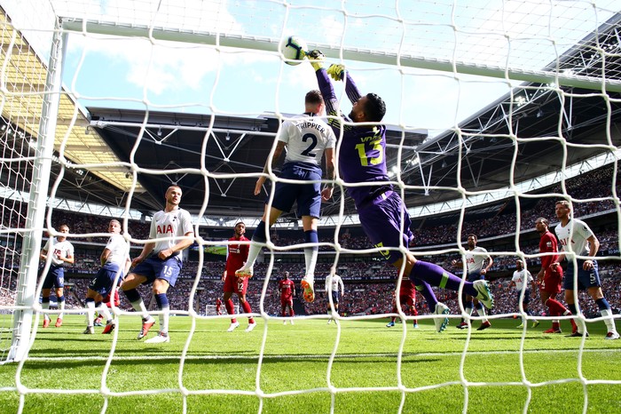 Liverpool menang 2-1 atas Tottenham Hotspur di Wembley, salah satunya berkat gol Georginio Wijnaldum ini. Bola sempat ditepis keluar oleh Michel Vorm, tapi teknologi garis gawang memastikan sundulan Wijnaldum sudah masuk gawang sepenuhnya. (Foto: Clive Rose/Getty Images)