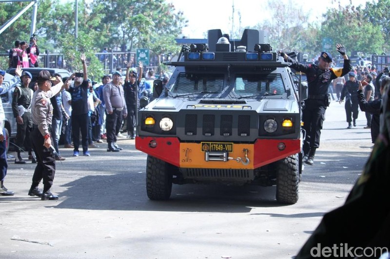 Momen kendaraan barracuda Brimob yang mengangkut pemain Persija tiba di Stadion GLBA.