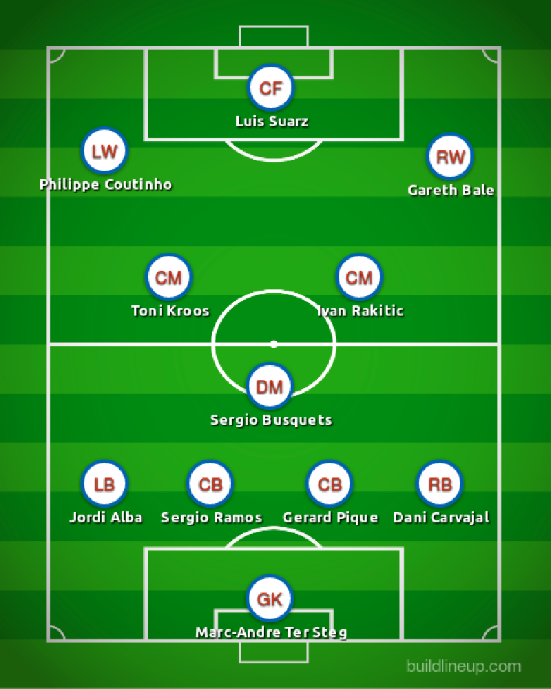 Beginilah gambaran kombinasi starting XI El Clasico antara Barcelona vs Real Madrid akhir pekan ini. Tanpa Messi dan Ronaldo, masih mentereng kan line up kedua tim. (Foto: buildlineup.com)