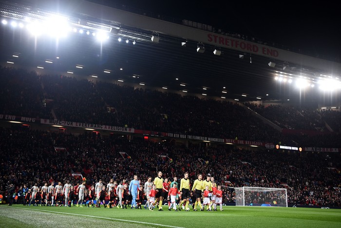 Old Trafford terlihat merah menyala karena flare tersebut (Clive Brunskill/Getty Images)