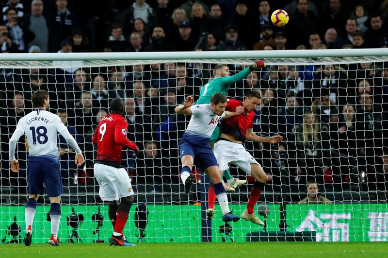 De Gea benar-benar harus jatuh bangun di laga ini. Salah satu penyelamatan terbaik yang dia lakukan adalah ketika menghalau tandukan Delle Ali di babak kedua (Clive Rose/Getty Images)
