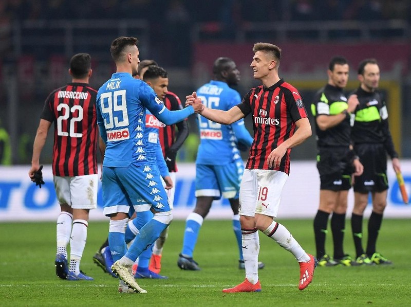 Milan dan Napoli masih menempati empat besar. Rossoneri di posisi keempat dengan raihan 34 poin, Partenopei ada di posisi runner-up dengan raihan 48 poin. (Foto: Miguel Medina/AFP)
