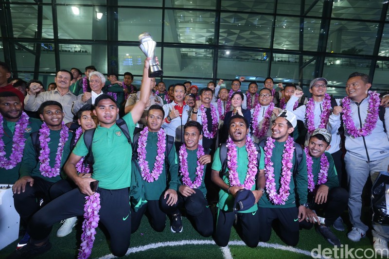Setiba di Bandara Soekarno-Hatta, Andy Setyo dkk disambut oleh Menpora Imam Nahrawi dan sekjen PSSI, Ratu Tisha Destria.