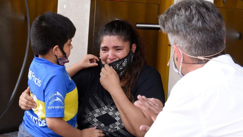 Ada pula seorang anak dengan jersey Boca Junior berusaha menenangkan sang ibu. Boca Junior adalah klub yang pernah dibela Maradona. (Foto: Getty Images/Fotonoticias)