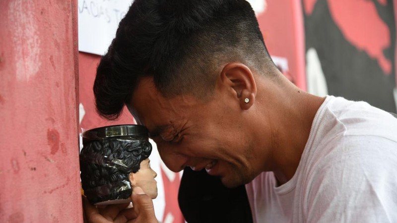 Salah seorang fans menangis di hadapan patung berkepala Maradona. (Foto: Getty Images/Luciano Bisbal)
