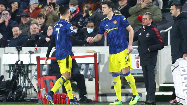 Cristiano Ronaldo ditarik keluar di pertandingan Brentford vs Manchester United, pada lanjutan Liga Inggris, Kamis (20/1/2022) dini hari WIBl. CR7 digantikan Harry Maguire. (Foto: Clive Rose/Getty Images)