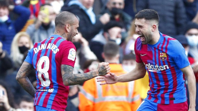 Barca ketinggalan duluan saat menjamu Atletico. Tapi assist Dani Alves bikin Barca bisa menyamakan skor lewat Jordi Alba. Foto: AP/Joan Monfort